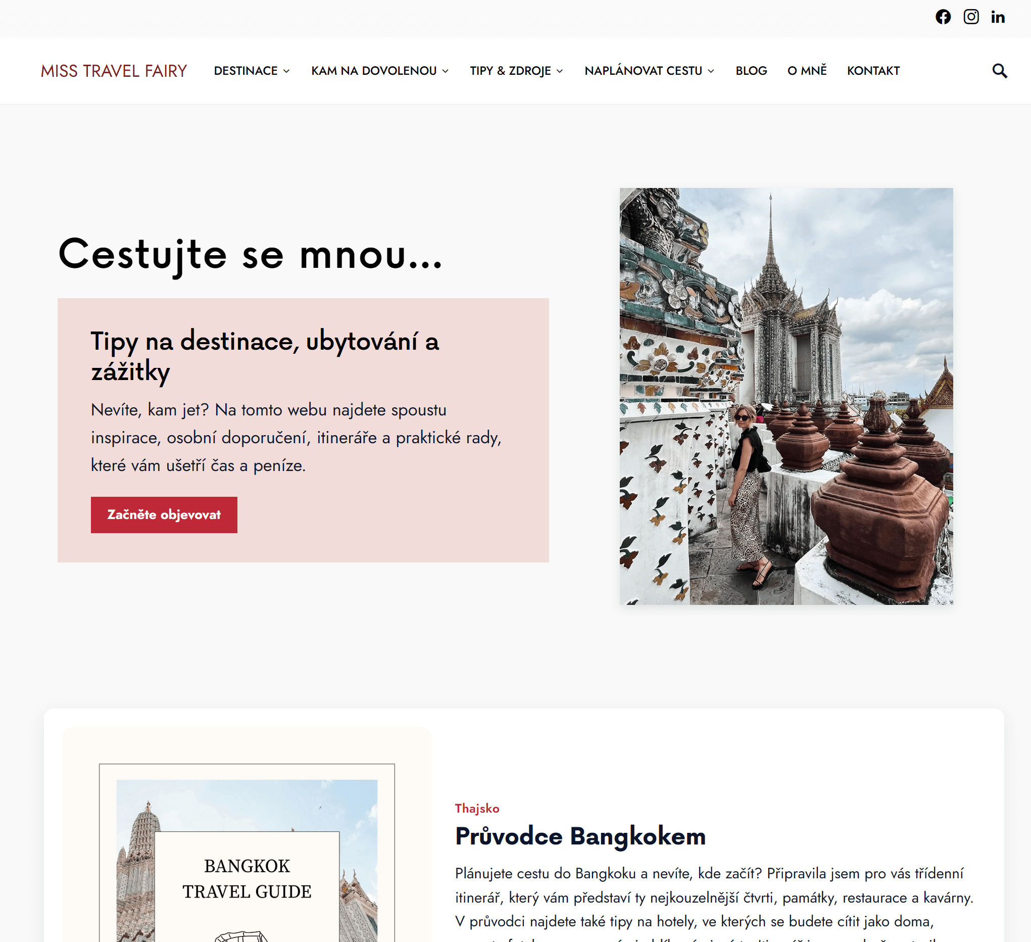 Web "Miss Travel Fairy" je určen pro nadšence do cestování, kteří dávají přednost objevování světa na vlastní pěst a pomalému cestování. Stránky nabízejí cenné tipy a inspiraci pro ty, kdo chtějí zažít autentické dobrodružství mimo tradiční hotelové resorty. Zaměřují se na výhodné vyhledávání letenek, plánování ubytování a tvorbu itinerářů, které vedou k objevování skrytých pokladů a kulturních zážitků po celém světě. Hlavní myšlenkou tohoto webu je podpora cestování jako prostředku k obohacení vzdělání a porozumění rozličným kulturám, zvykům a tradicím. "Miss Travel Fairy" inspiruje cestovatele k vytváření nezapomenutelných zážitků a objevování světa z perspektivy místních obyvatel.