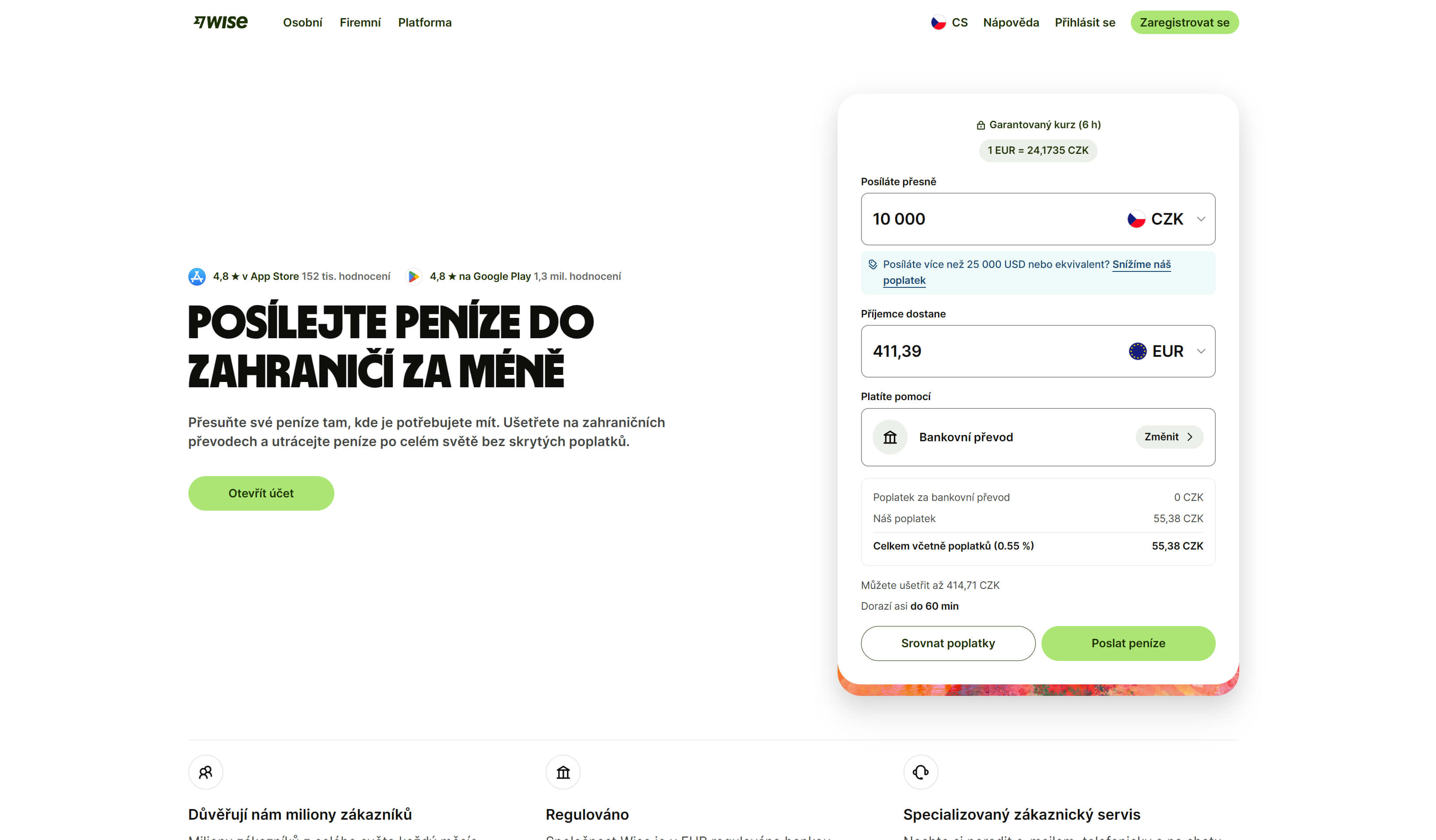 Wise používá skutečné směnné kurzy (tzv. mezibankovní kurzy) a za převody si účtuje pouze malý, transparentní poplatek. To je zpravidla levnější než poplatky tradičních bank.
